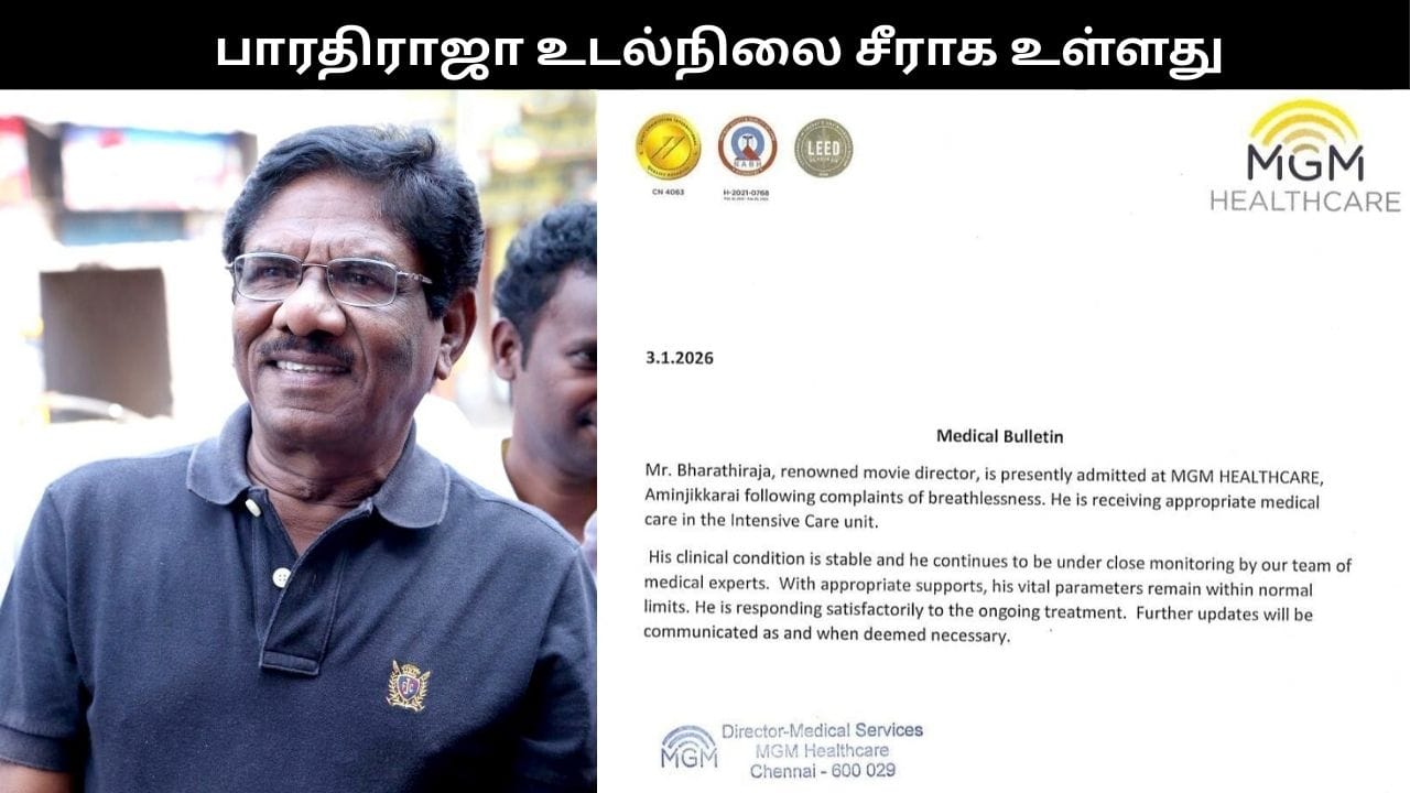 அதன்படி, பாரதிராஜா உடல்நிலை குறித்து எம்ஜிஎம் மருத்துவமனை நிர்வாகம் தற்போது அறிக்கை வெளியிட்டுள்ளது. அதில், இயக்குநர் பாரதிராஜாவுக்கு மூச்சுத் திணறல் ஏற்பட்டதையடுத்து, தற்போது சென்னை எம்ஜிஎம் ஹெல்த்கேர் மருத்துவமனையில் அனுமதிக்கப்பட்டுள்ளார். அவருக்கு தீவிர சிகிச்சைப் பிரிவில் (ICU) தேவையான மருத்துவ சிகிச்சைகள் அளிக்கப்பட்டு வருகின்றன.
