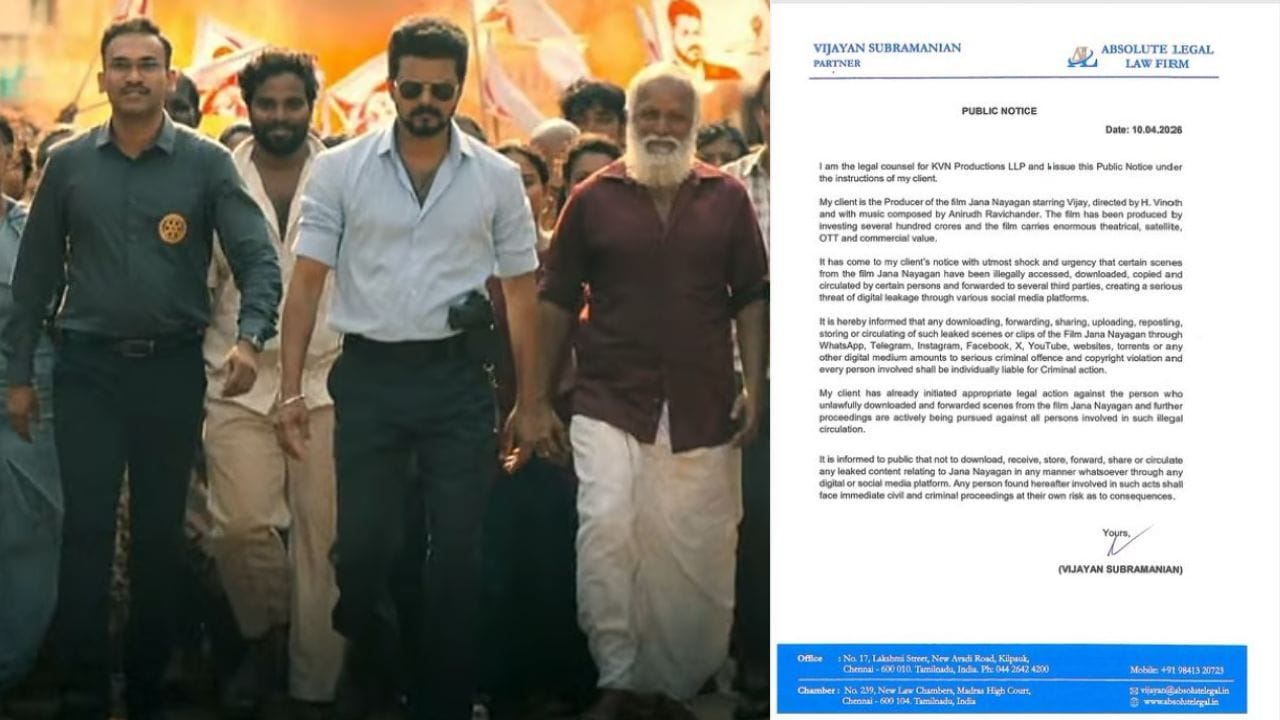 இப்படி இருக்கும் சூழலில் நேற்று 09-ம் தேதி ஏப்ரல் மாதம் 2026-ம் ஆண்டு நடிகர் விஜய் நடிப்பில் உருவாகி உள்ள ஜன நாயகன் படத்தில் இருந்து சில காட்சிகள் இணையத்தில் கசிந்து வைரலானது. அதனைப் பார்த்த படக்குழுவினர் பேரதிர்ச்சி அடைந்தனர். மேலும் ஜன நாயகன் பட காட்சிகளை சட்டவிரோதமாக பதிவிரக்கம் செய்யவோ, வெளியிடவோ கூடாது என்றும் எப்படி செய்வோர் மீது சட்ட நடவடிக்கை எடுக்கப்படும் என்றும் படக்குழு தற்போது நோட்டீஸ் வெளியிட்டுள்ளது.
