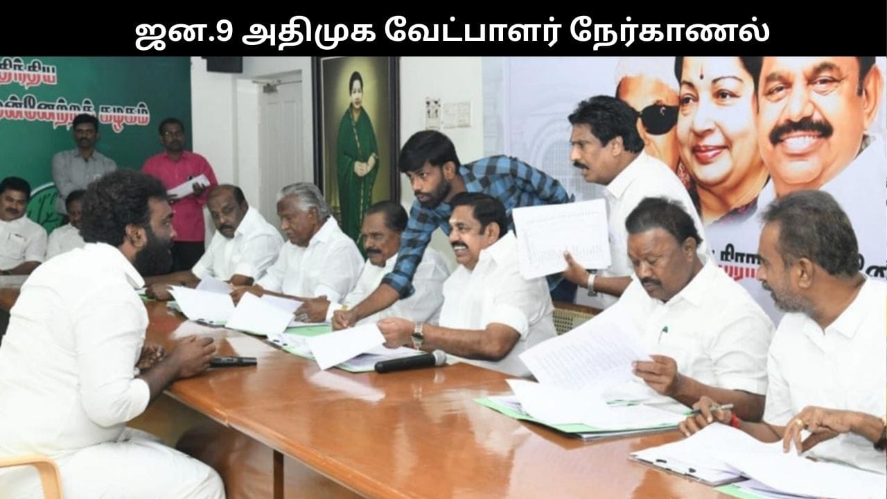 AIADMK candidate interview: தமிழ்நாடு சட்டமன்ற பொதுத்தேர்தல்; புதுச்சேரி மற்றும் கேரள மாநில சட்டசபைத் தேர்தல்களில், அதிமுக சார்பில் வேட்பாளர்களாக போட்டியிட வாய்ப்பு கோரி, விருப்ப மனு அளித்துள்ளவர்களுடன் நேர்காணல் ஜனவரி 9ம் தேதி முதல் சென்னை அதிமுக தலைமை அலுவலகத்தில் நடைபெற உள்ளது.