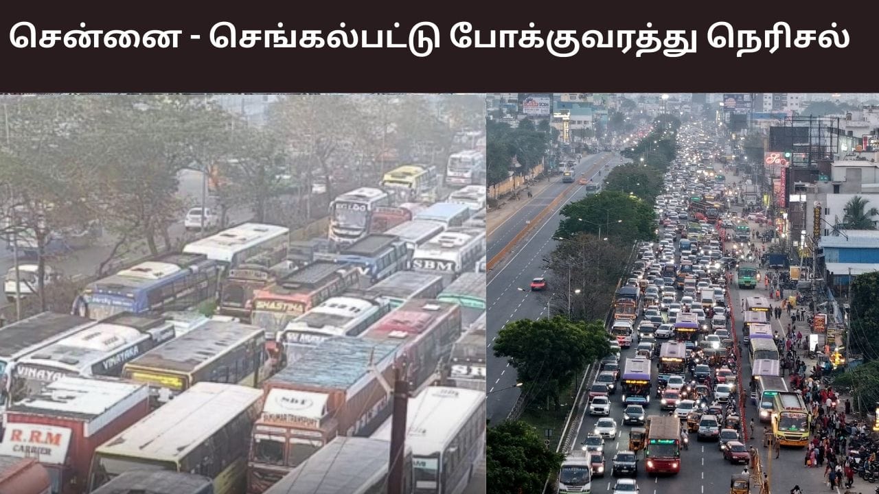 Chennai Traffic Congestion: பல லட்சம் மக்கள் ஒரே நேரத்தில் சென்னை திரும்பியதால், சென்னை – செங்கல்பட்டு தேசிய நெடுஞ்சாலை, தாம்பரம், பெருங்களத்தூர், வண்டலூர், ஊரப்பாக்கம் உள்ளிட்ட பகுதிகளில் கடுமையான போக்குவரத்து நெரிசல் ஏற்பட்டது. சில இடங்களில் வாகனங்கள் மணிக்கு 5 முதல் 10 கிலோமீட்டர் வேகத்தில் மட்டுமே நகர்ந்ததாக தெரிவிக்கப்பட்டுள்ளது.