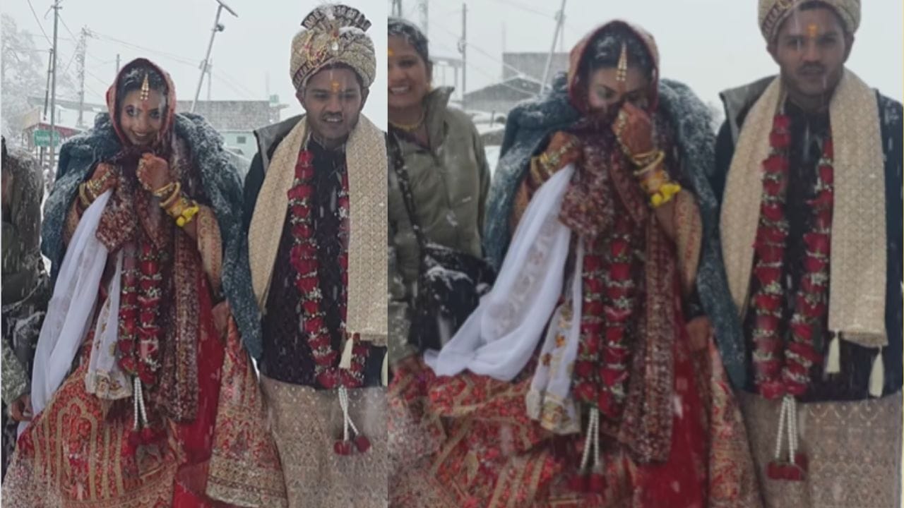இணையத்தில் வைரலாகி வரும் அந்த வீடியோவில், ஜோடி ஒன்று கொட்டும் பனியில் திருமணம் செய்துக்கொள்கிறது. இந்திய பாரம்பரிய திருமண உடையில் இருக்கும் அவர்கள் கொட்டும் பனியில், குளிரில் நடுங்கியபடி நடந்துச் செல்கின்றனர். இவை அனைத்தும் அந்த வீடியோ காட்சியில் பதிவாகியிள்ளது.