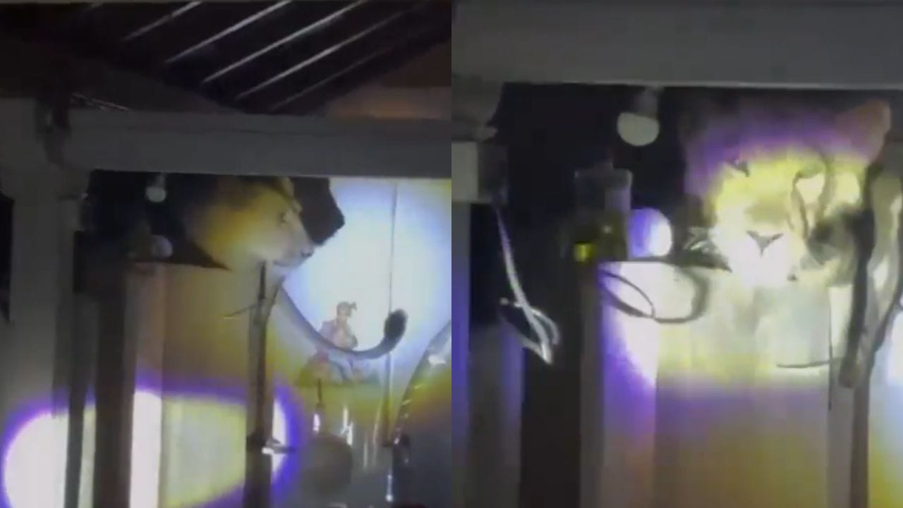 இந்த வீடியோவில், வீட்டில் உள்ள சமையலறையில், பெரிய சிங்கம் ஒன்று புகுந்துள்ளது. அந்த சிங்கமானது கிச்சனில் மேலே ஏறி அமர்ந்து இருக்கிறது. அந்த சிங்கமானது பயந்து மேலே அமர்ந்திருப்பது போல் இருக்கிறது. அந்த சிங்கத்தை அங்கிருந்து மனிதர்கள் சில டார்ச் லைட் அடித்து அது எங்கே அமர்ந்திருக்கிறது என்று பார்ப்பது வீடியோவில் தெரிகிறது.
